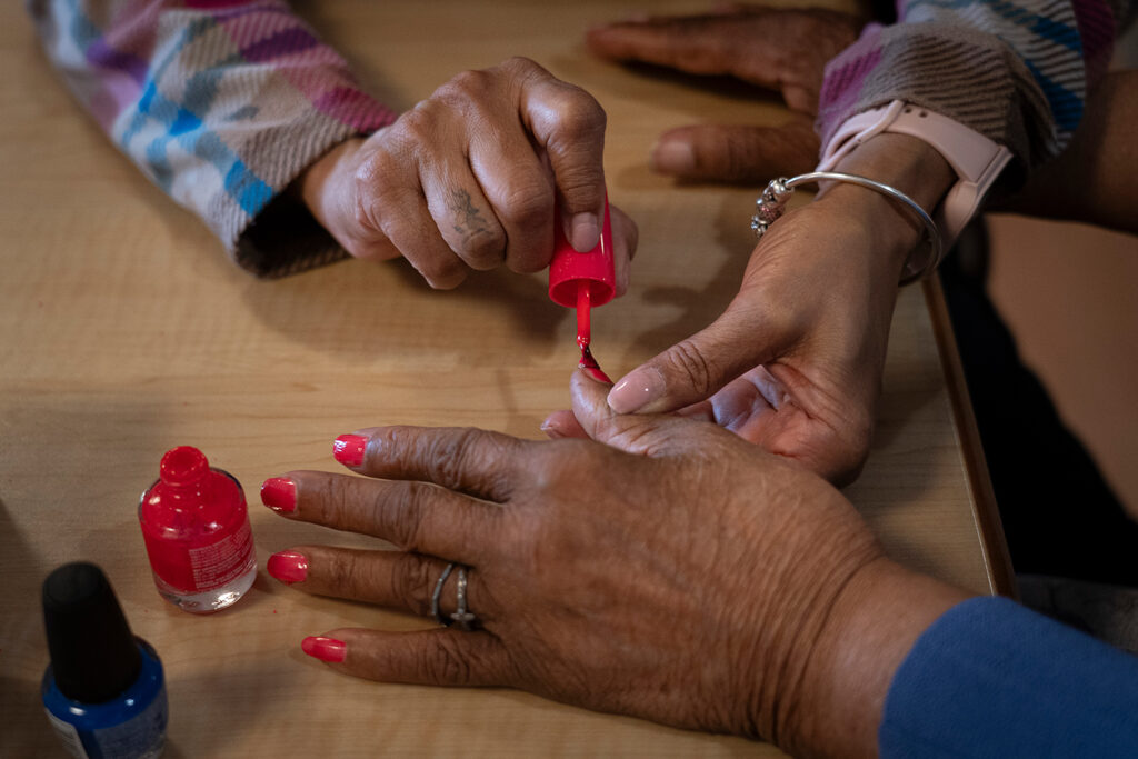 At a small table in one of the activity rooms, Dookie expertly applies a coat of ruby-red nail polish for a resident, while another waits patiently for one of her signature hand massages.