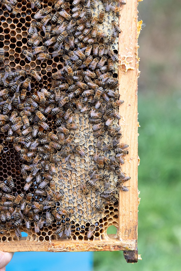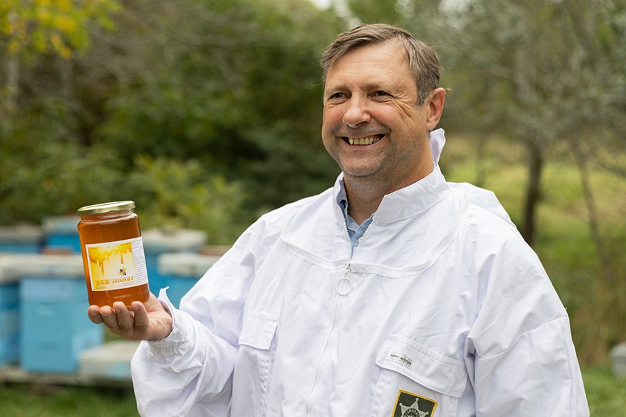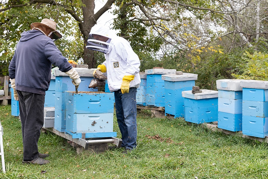 Each summer, he and his father suit up in protective gear and tend to dozens of hives at their two apiaries. They gently brush away bees to harvest honeycombs, strain the honey, then jar and sell out of his home and the St. Joseph’s Gift Shop. They also produce and sell beeswax and propolis tincture— a resin-like product known for its anti-inflammatory properties.