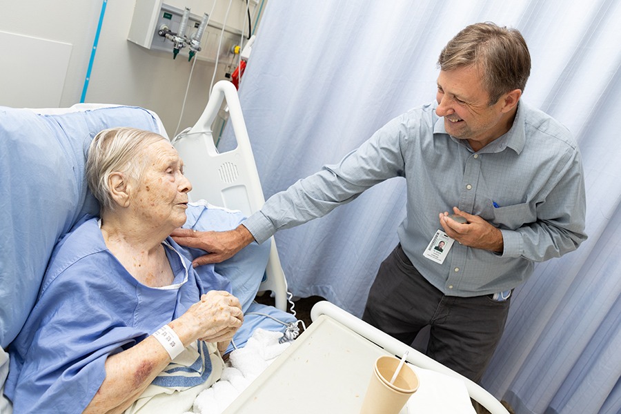 A patient could be in shock after receiving a new diagnosis, facing the unknown or even death. Sometimes he will just sit with them in silence until they are open to talk. He also advocates for his patients, connecting one with an occupational therapist after they expressed fear about using stairs when they were due to return home.