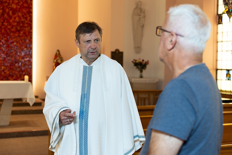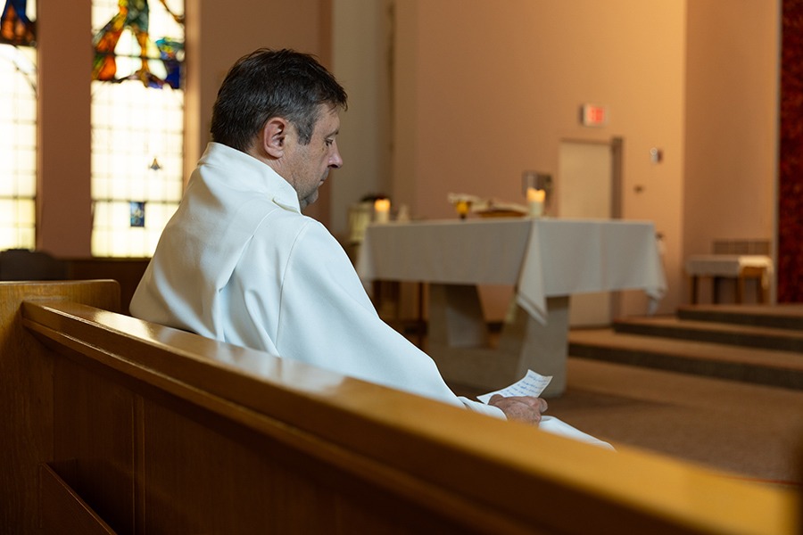 For the past five months, Hemon has built a relationship with a patient in the ICU and his wife, offering daily communion and companionship at the bedside. “I have ALS. I cannot walk, move, or anything like that. It’s not something you recover from,” says the patient. “Being in a hospital that has spiritual care is very meaningful for me.” On this particular day, Hemon performs the sacrament of the sick, anointing him with blessed oil and offering prayers of healing and peace. “It’s not only about healthcare. For a person like me with a fatal disease, one has to prepare. And in order to prepare, you prepare spiritually.”