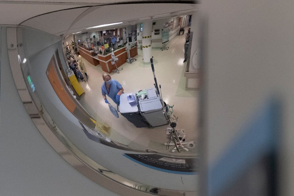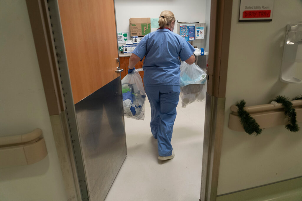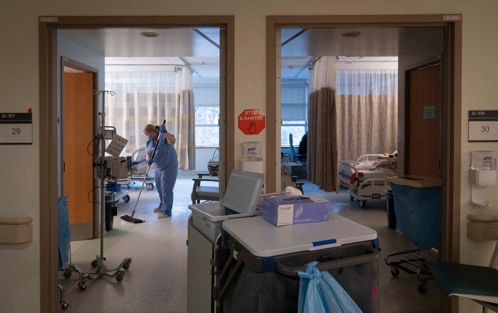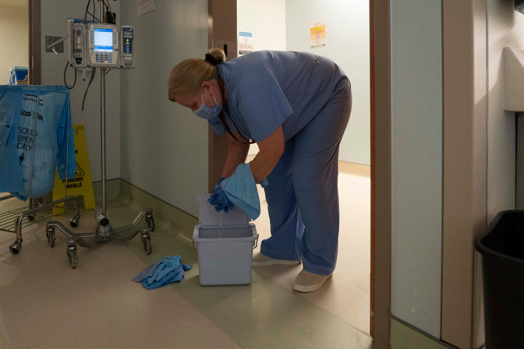 After Loureiro finishes removing the garbage she cleans the nursing stations, mops the floors, and disinfects each of her assigned patient rooms, wiping down all surfaces.