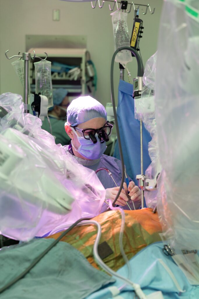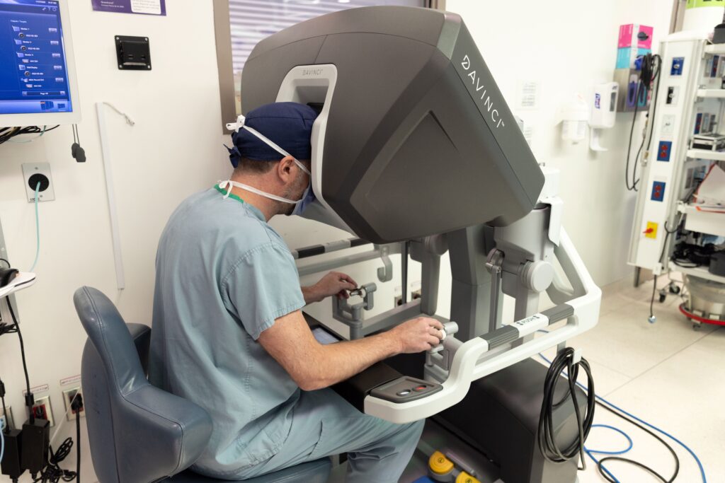 During the procedure, Bisleri and Burns worked in close coordination. The da Vinci system is controlled from a nearby console, where the surgeon views a magnified three-dimensional image of the surgical field and uses hand and finger controls to perform delicate, highly precise movements.