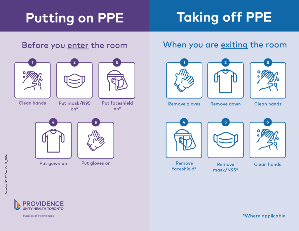 Following the correct steps for putting on (donning) and taking off (doffing) PPE protects you from inadvertent self-exposure. When a resident is on precautions, signage-as the one shown below-will be posted outside the resident room to help guide you on how to safely put on and take off personal protective equipment (PPE).